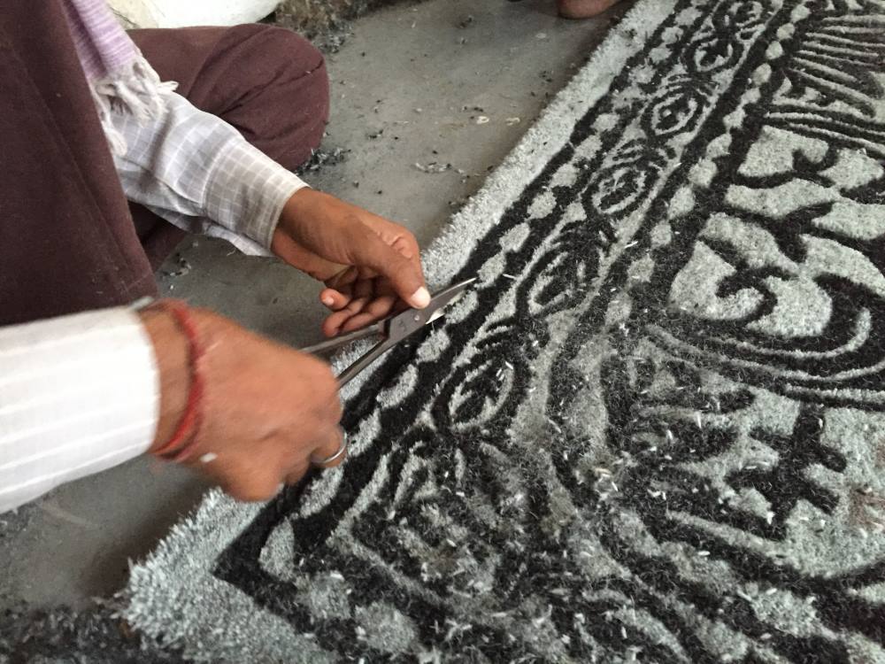 Skilled artisans carve patterns into the rug pile to create a textured, three-dimensional effect.